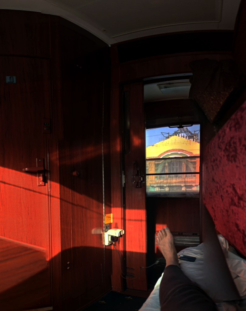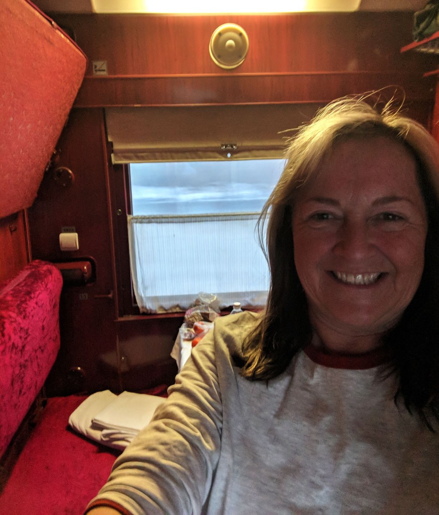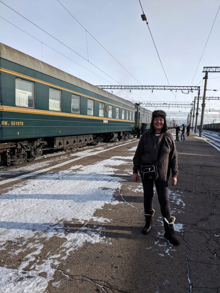 We all lurked in our cabins until they frisked our little homes looking under the seats, in the toilets and in the luggage spaces above the doors. When they were satisfied the sniffer dog came along the corridor (that’s why the toilets get locked, in case smugglers try to flush contraband ) This completed along came a very serious woman in military uniform. Obviously, I have no photos of this section of the journey. If you saw Joanna Lumley’s programme about the Trans Siberian Express you’d have seen the authorities get very angry about the cameras which had to stop filming.