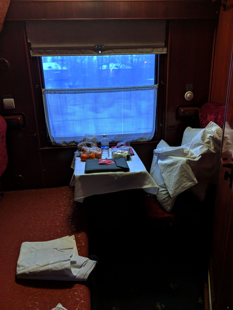 Now the check on my passport was fascinating. She scrutinised at it with infrared and ultraviolet light under an eyeglass for a good few minutes then looked at all my stamps and visas. Then she got out a little device that she ran up and down the spine and pages. This fastidious check seemed so much more intense than the cursory one arriving in St. Petersburg. Maybe I looked shifty because I so needed to relieve my bladder and she picked up on it or maybe it’s normal but the whole check seemed more stringent on the train. I was then told to sit and wait for them to finish. I heard a lot of other people muttering as all this went on but we all wisely stayed in our cabins only daring to stand in the doorways. It would have been funny if it hadn’t been so serious.