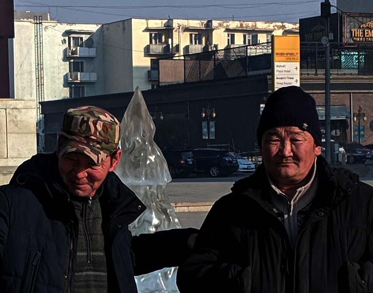 Two lovely Mongolians near their dinosaur museum