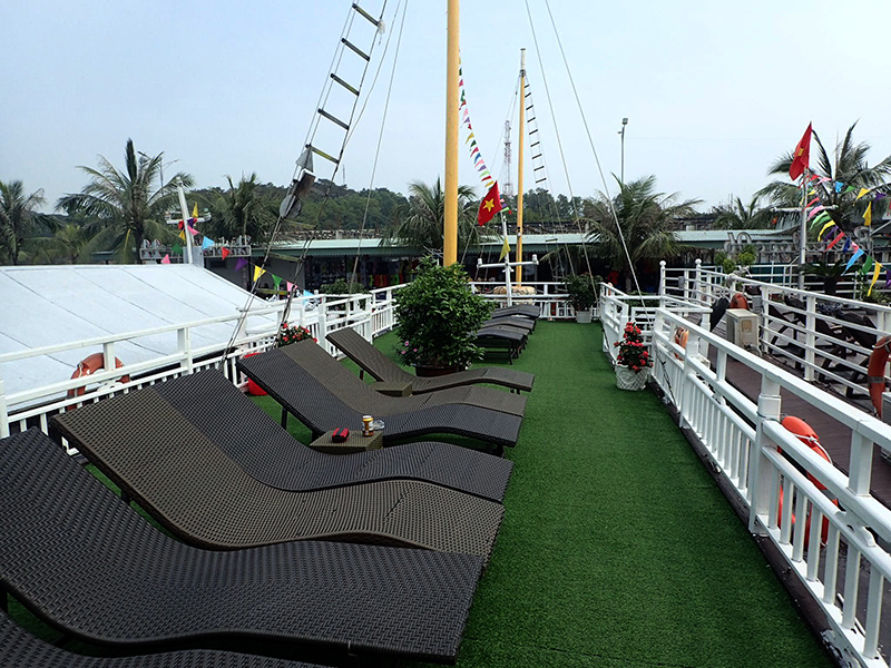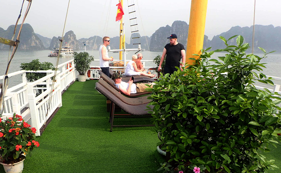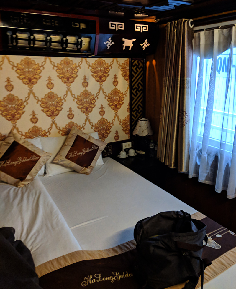 There was a huge milling crowd of tourists at the quay which compounded my suspicions. There are hundreds of these tour boats around Halong and the photos in the tour magazines must be from the turn of the century as it’s nothing like those idyllic pictures. We finally boarded our junk and were allotted rooms. I loved my room which was just by the restaurant and bar. I’m an idiot. It was so pretty and quaint if a little faded. This and the astroturfed top deck would be fantastic for sunbathing and having a cocktail watching the sunset. Surely the sun was breaking through?