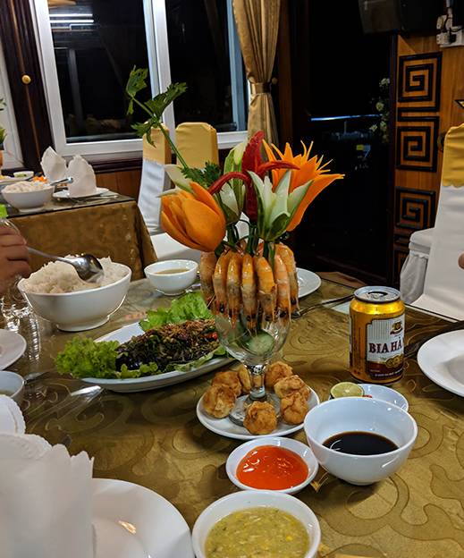 Caves done we were dragged off to some beach island to enjoy another climb for the view but you had to be back in half an hour. Pass. Then chop chop back to the boat for a lesson in making Vietnamese spring rolls. Pass. You only had to throw pre-cut veg, noodles and duck into rice paper and roll them up. Less of a lesson in cooking more in greed as the first few gannets scoffed all the duck. Dinner and more beers and bed I thought. The dinner was lunch re-hashed and the beers pricey (independent bar) so I thought I’d hit the hay and went to my ornate little room to write my journal. I was happy to have all the nagging over for the activities. I just needed a good sleep and then I’d be in a better mood and quit whining.