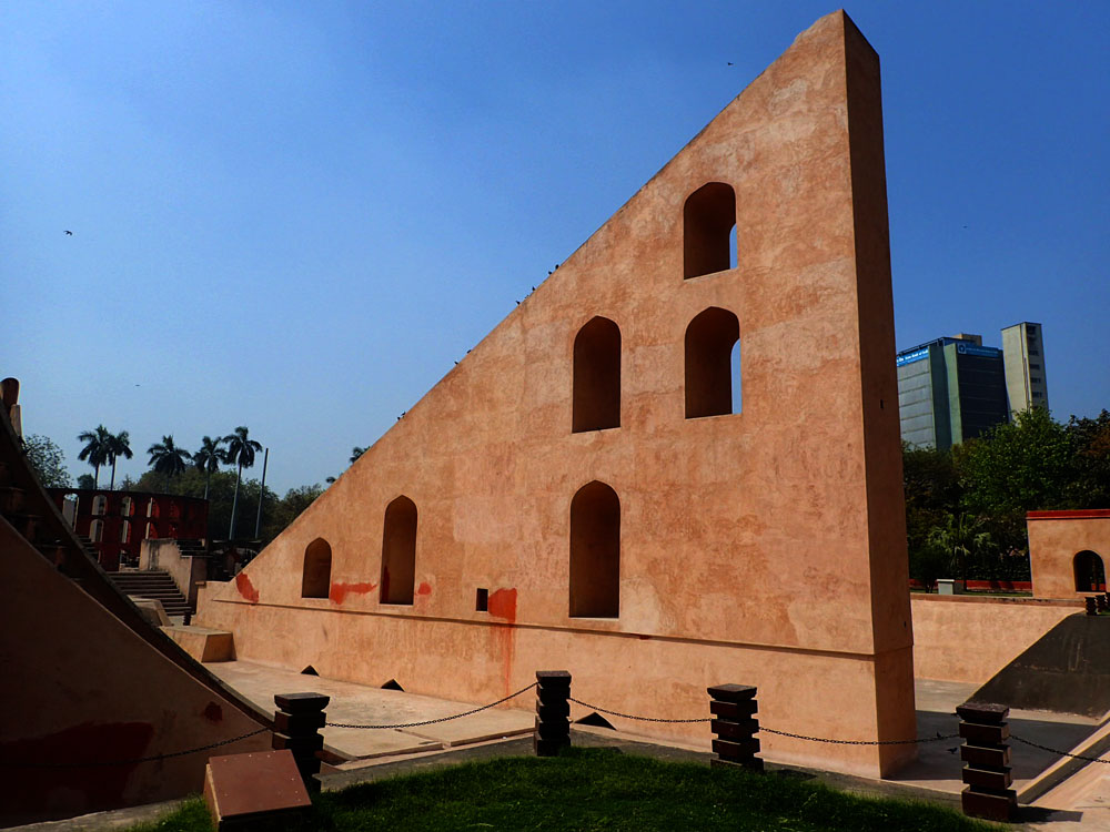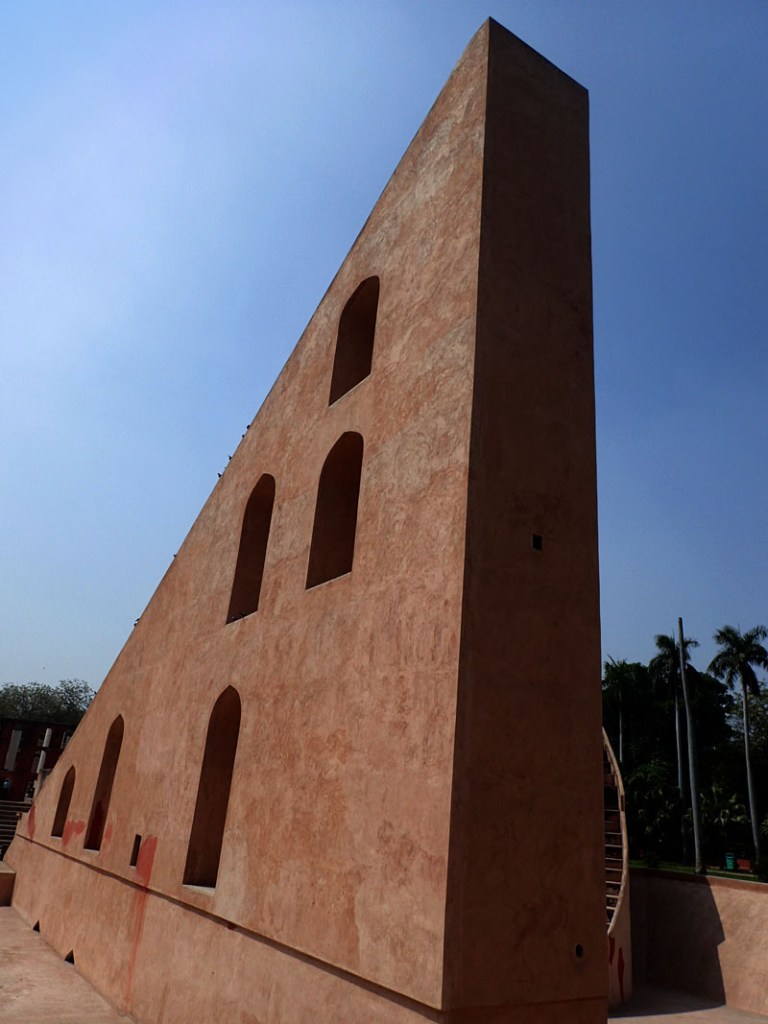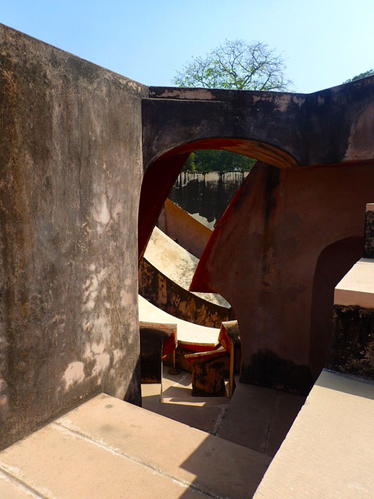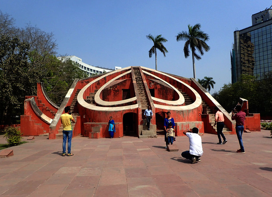 Shower to wet hair then long shorts and a shirt and my loyal trusty cap. Then a dash over the mad Delhi streets to view close up the bizarre and beautiful huge sundials and astronomical ‘instruments’ built by a stellar dreamer Mughal emperor Muhammad Shah, who allotted the task of re-examining the calendar and astronomical records to Maharaja Jai Singh II. These timepieces are accurate. The main purpose of this observatory was to compile astronomical tables and predict the time and movements of the sun, earth and planets. All the observatories have a large array of astronomical instruments used to study the heavenly bodies. The Jantar Mantar of Jaipur has the largest stone sundial of the world.