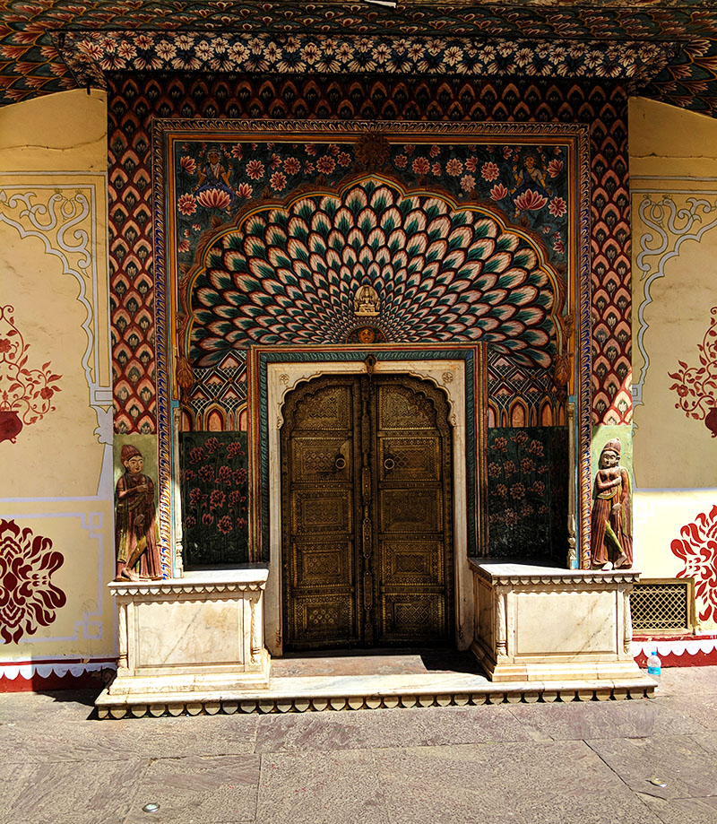 The City Palace is a joy. Pretty pastels abound occasionally punctuated with richly coloured peacocks. Ornate and beautiful with several courtyards, buildings, pavilions, gardens, temples, and peacock embellished doorways and a gallery of all the Mughal Emperors One of who is fondly known as John Lennon, I wonder why?!