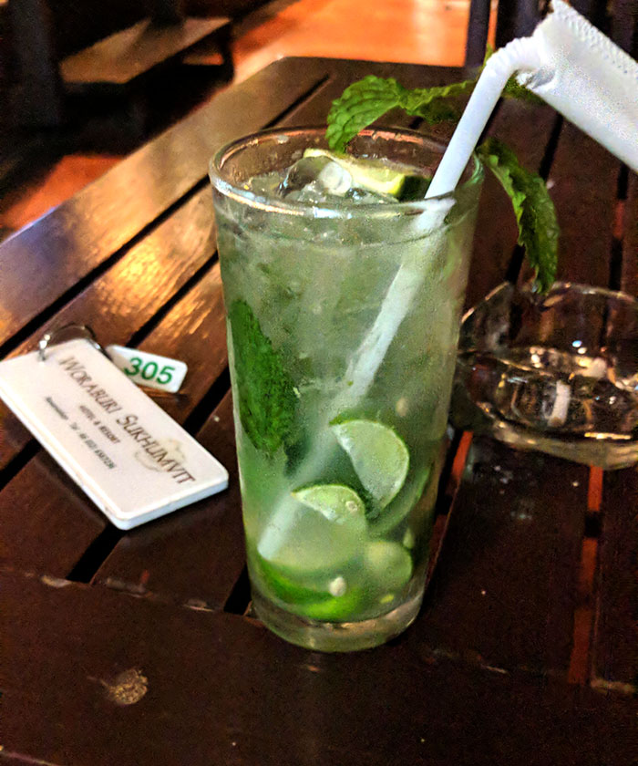 I arrived in my cheap and cheerful Woraburi Sukhumvit Hotel and took a bit of a dislike to my room so had it changed already alerting the desk I was a tough old bird and I wasn’t going to be palmed off with a shit room. After that there was a lot of hostile frostiness and I felt myself growing gloomy. The hotel wasn’t cheap and cheerful, just cheap. Bad news. As it was late in the day I just got a light meal and sat on the outside terrace, listening to the rain plopping down on the table umbrella and drinking their very fine mojitos and planning the next day. I would just go in wander mode and check out the park near the hotel. I knew I needed an early night as I was feeling a bit blue and missing India. I had to go break my plummeting feelings cycle in my room. In my space.