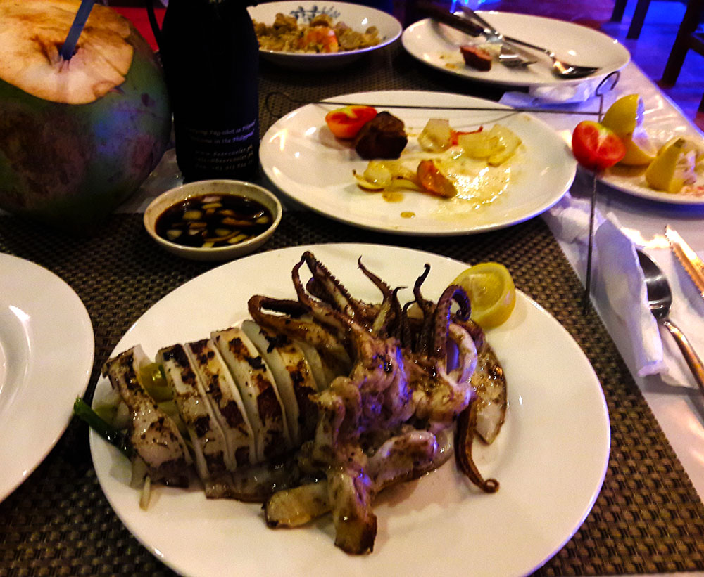There was a place that you could just rent your snorkelling stuff and go down a steep path to swim around the shore line, or if you dared, jump off the cliff on a diving board to the waters below. I have to confess I chickened out on that score my vertigo would not allow, but in retrospect I should have done it and certainly would if offered another chance. After sitting in the sun and going in and out the water we got peckish. Returning we stopped at a restaurant come guest house where we had had a quick coffee in the morning and they had been really friendly. They had fresh fish outside on ice and were out of town, so was going to be a better bet than in town. We chose from the fish (I finally chose lasagne ffs!) A. had the stuffed squid that was indeed excellent (or so he said I couldn’t fancy it personally). A little karaoke had started over the street which was an omen of things to come later in my trip, so I said maybe it was time to call it. However then we noticed what was to become a constant topic of conversation over the next couple of days. It was about a creepy guy.