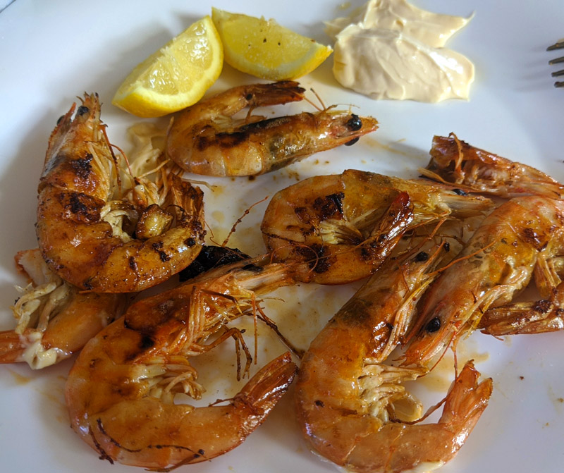 Once at the supermarket I sorted through my mental list. First I needed tweezers for my Dennis Healey eyebrows and razors for my legs and pits. You always forget how quickly hair grows when you’re in the heat as do your nails. I went and got emery boards too for my talons. Satisfied with this then came cotton wool and hair colour to fix my roots and a body spray as they only had vey expensive eau de cologne. Boom toiletries done I went to the fish section. For days I had lusted after gambas and fish in general so I got my giant prawns with shells on, tuna steaks and some frozen white fish. I chucked in a frozen T-bone and spinach for good measure. Next I hunted down the parmesan as I also carnal thoughts about it, fixated on making aglio, olio peperoncino pasta with massive amounts of butter and parmesan heaped on top. I decided to ignore the vodka as I’m drinking rather a lot at the moment and spotted snorkel and mask sets that I had promised myself to get my water mojo back. I got a dashing fluorescent yellow and black one then went and paid.