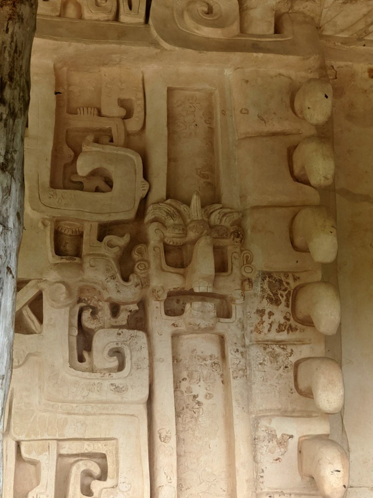 It all starts with a very petite Petén arch into the complex. Then things go a bit mad as there’s a swirly kind of building which is a bit like a Mr Whippy, at the side of that a large tumbledown stone artifice with all types of cacti, trees, honeysuckle and creepers all over it, because of this strange mixture of artifices, you sort of loose your bearings until you get round the corner where the main plaza is.