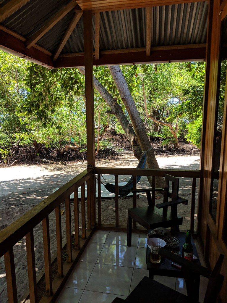 Staying at the Novita [first awful homestay] nearly ruined this trip and now I’m at Caka [second mangrove hotel cabins] I think I’ll stay extra time. I have been feeling weary the last few days must use this as a pit stop for relax as well as manic snorkelling. Must add an extra bit about Novita hell hole. The electric kept cutting out and my room was like the black hole of Calcutta and Dantes ‘Inferno’ thrown in too. ‘Pappa’ [The man at Novita married to the venemous old bitch] was an arsehole who took me out in his shitty old boat without enough petrol. When my Dutch mate joined me in the afternoon things went really pear shaped and we really saw the nasty side of him, he even stopped the boat over it and I readied myself to get attacked by the madman! I even picked up the rung that had fallen off the ladder to defend myself!