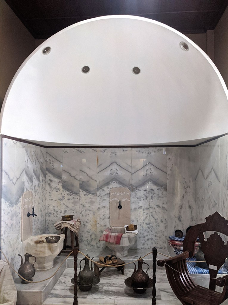 Showcases of various metalwork including locks and keys and a plethora of weird and wonderful bits from the past entranced me. There was even a mobster-style car alongside a mock-up of a marble interior of a hammam and its accoutrements.