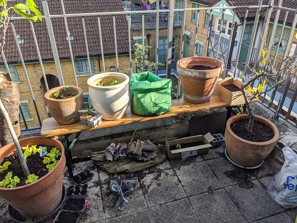 The emptying of my neighbour’s troughs and moving them up to my terrace was a huge physical challenge but well worth it. It was done over the course of two days along with some Victorian chimney funnel bricks to raise them and make it less back-breaking than grovelling around on the floor. I also have used one of my kitchen benches to raise smaller pots.