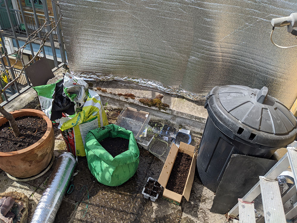 Now, this is so completely alien to me as I learned about crop growing when I was still a child at our cottage on a farm. There I had access to wheelbarrows of horse poo straw and well, just the shit too, that dad and I would squabble about. Also, it was a lot of land, and the soil was already rich and established. We watered easily by hose or from the pond and had a ramshackle greenhouse with all sorts of bits and bobs one gathers over a long period of time. No such luck here, up to twenty watering cans a day up the stairs.