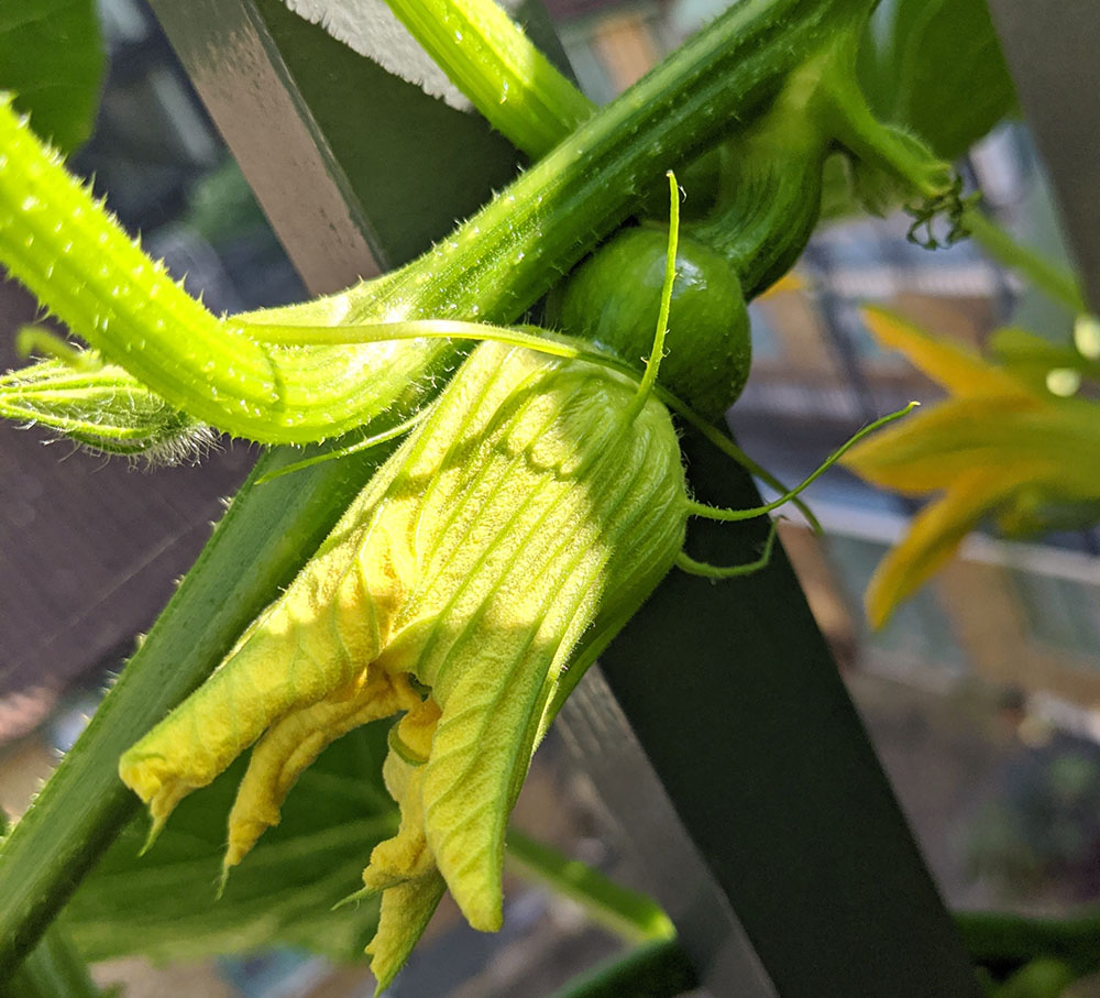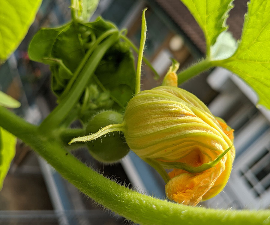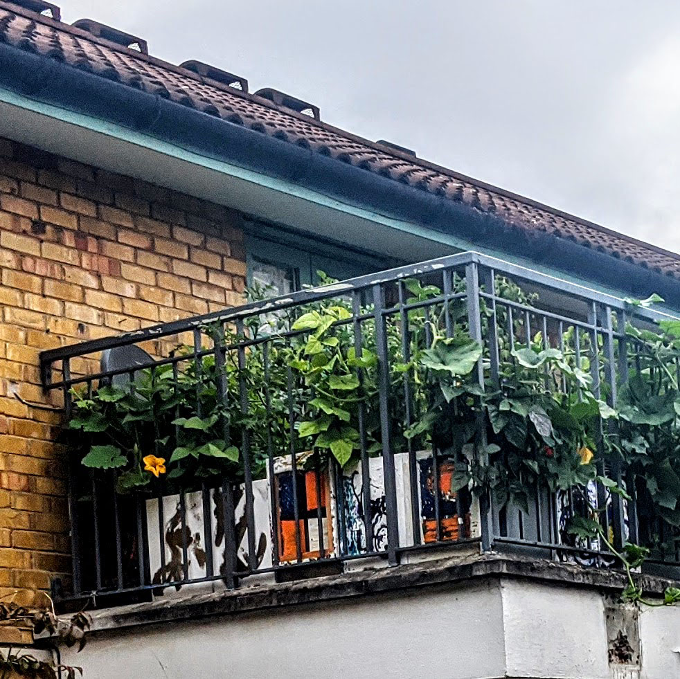 I have to confess that the naughty squash do like to grow outside the railings so I had to invent and make some string hammocks for them except for one big boy that grew between the railings just to make my life more complicated!