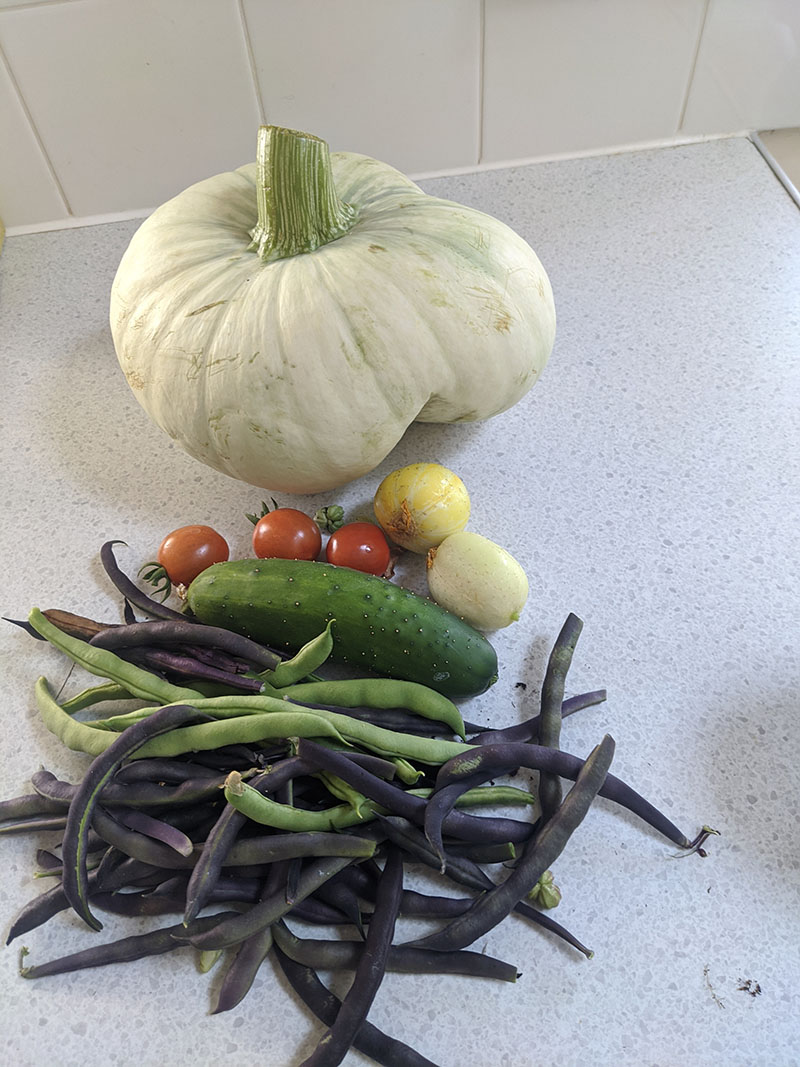 Monster squash, black and green beans , tomatoes, lemon and gherkin cucumbers