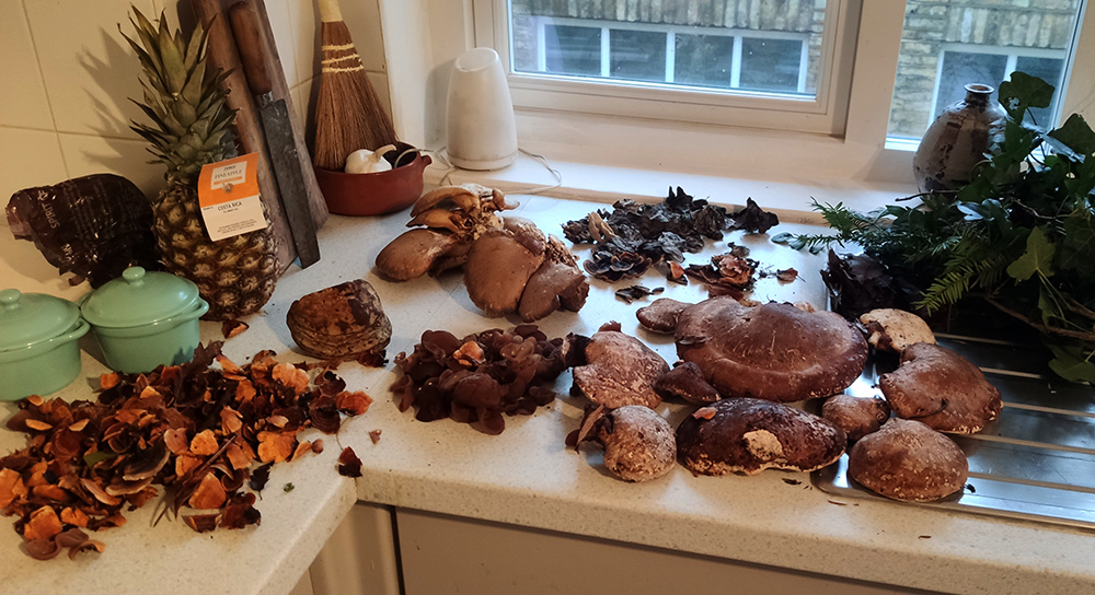 OR, MY FIRST JELLY OR JEWS EAR GOING IN MY SOUP. OYSTER, POLYPORE AND TURKEYTAIL.
