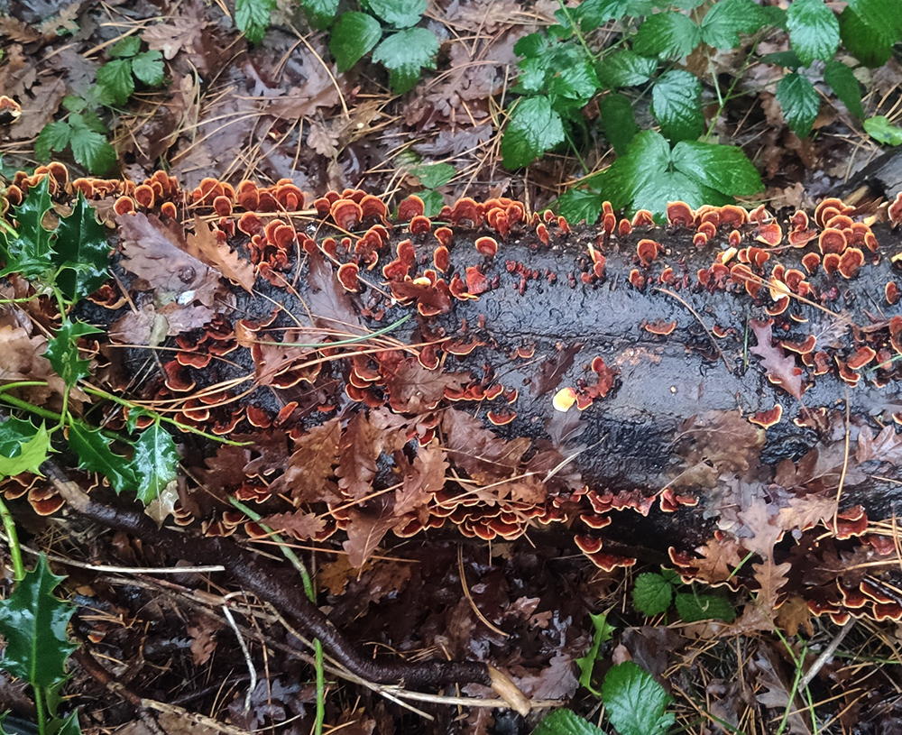 As soon as we entered the very beautiful and empty woods we happened upon a log that was covered in what looked like mauvish blisters amongst the thick ivy and debris.