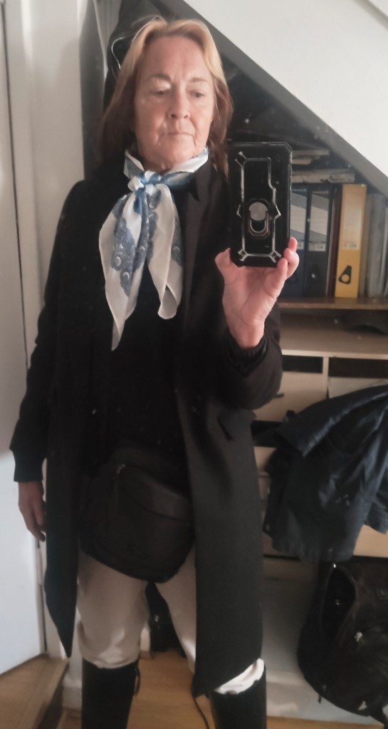It had started so sunny, but chilly and the forecast was for gloom and a little rain so I tried my best to look smart casual without freezing to death; ended up with an actual jockey crossed with a rather frumpy queen when I put on my previously jaunty neck kerchief and used it as a headscarf, but hey, beggars can’t be choosers. We met without incident and boarded our train to Lyme Regis. There in our seats the huge fatigue set in on a very tedious, very flat train ride to Norfolk. Boston startled me by snoring suddenly and even had a snort in a very horsey way at some point. We were off!