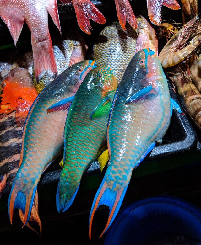 KK, BORNEO, MALAYSIA. AT THE NIGHT MARKET OF FABULOUS FISH.